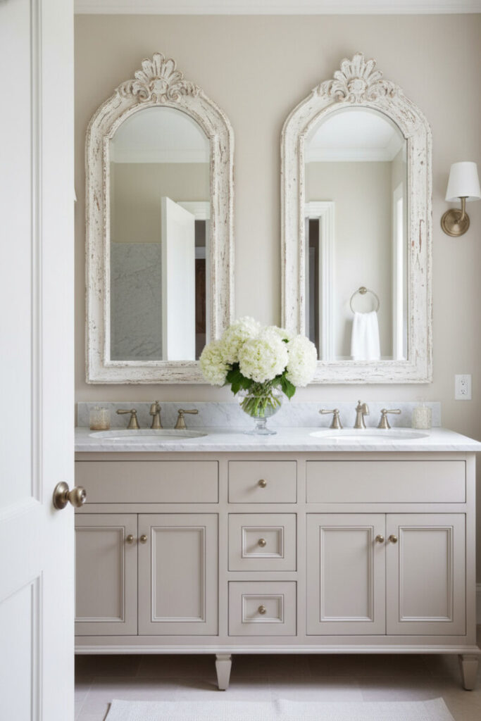Distressed, arched frames with Rococo notes bring romance without tipping into costume. Keep the palette soft—oyster, cream, pale taupe—and top the vanity with hydrangeas or peonies for an editorial flourish. Among Double Bathroom Vanity Mirror Ideas, French silhouettes excel at softening boxy cabinetry and injecting history into new builds. Use antique brass or champagne bronze faucets to harmonize the old-world finish.