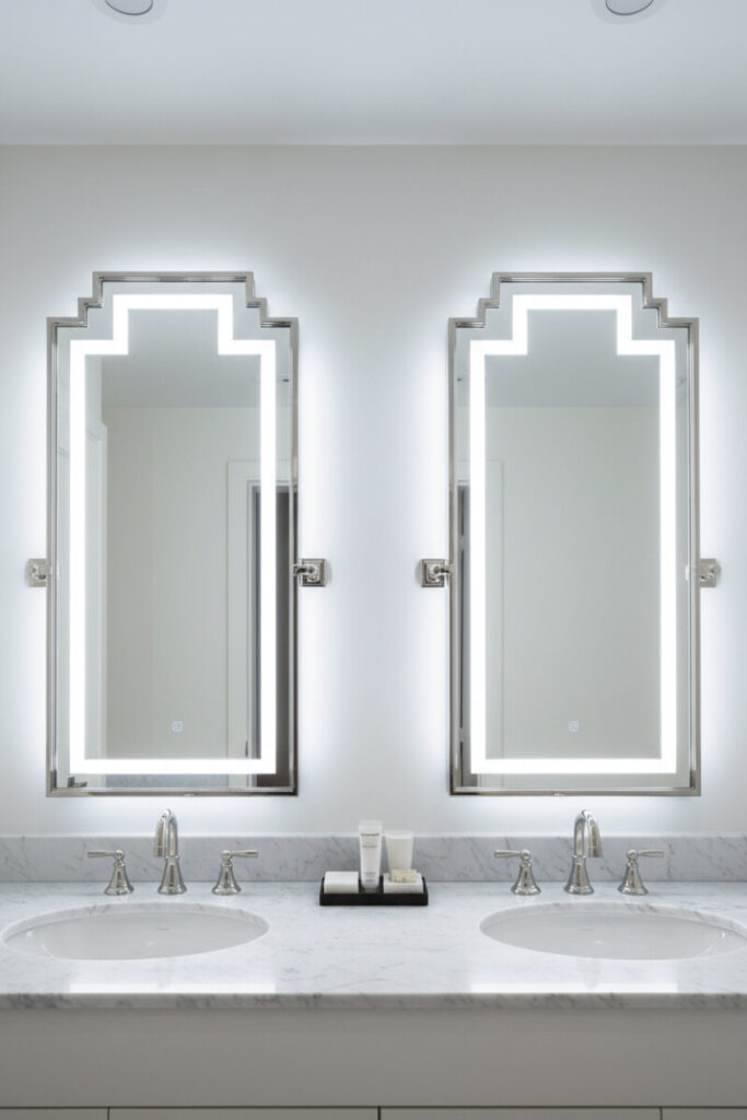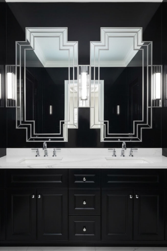Stepped, chrome-clad frames and lacquered black walls channel pure Art Deco drama. To pull this off at home, keep the vanity long and low with a bright white quartz top so the geometry can breathe. Cool white lighting emphasizes contrast and shows off metal lines. This is one of the boldest Double Bathroom Vanity Mirror Ideas, perfect for design lovers who want a cinematic, high-contrast statement.