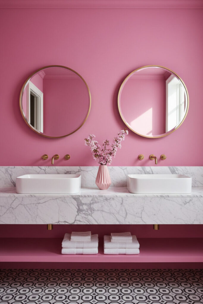Round mirrors add playfulness and balance when everything else is rectilinear. In a color-soaked bath—think pink walls or patterned tile—brushed gold rims and vessel sinks feel fresh, not fussy. If you’re building a gallery of ideas that flirt with fashion, this one wears the crown. Keep styling tight: a single floral moment, a marble tray, and towels on a minimal shelf.