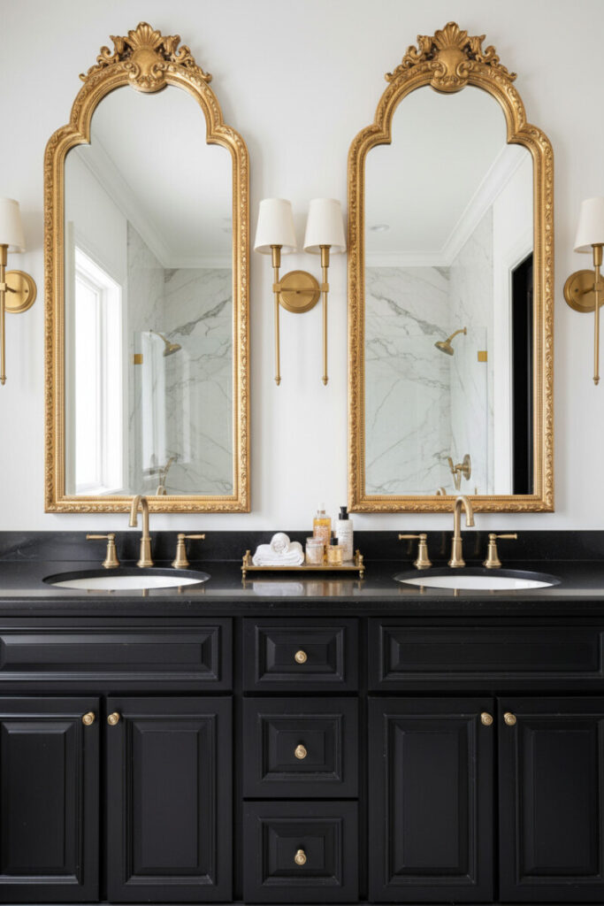 Carved gold frames over glossy black cabinetry deliver unapologetic luxury. Widespread brass faucets, fabric-shade sconces, and marble slab showers reflected in the mirrors reinforce the high-glam narrative. Designers return to this look because it photographs beautifully and reads special in person. If your taste skews neoclassical, file “Gold Glamour” under must-try Double Bathroom Vanity Mirror Ideas.