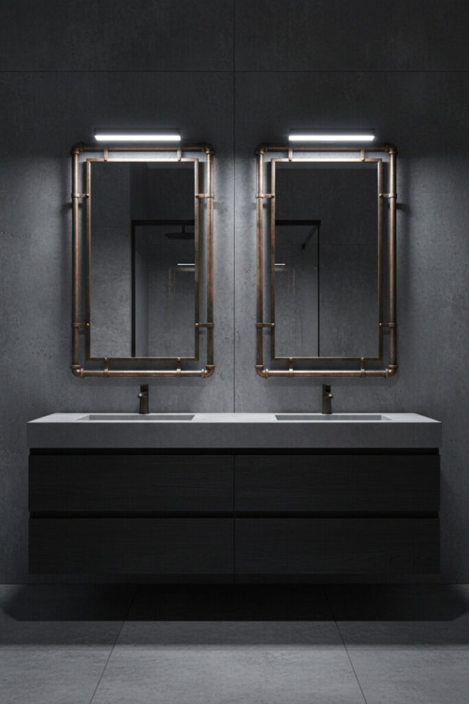 Exposed-pipe borders in bronze or aged copper bring character to lofts and new builds alike. Pair with concrete counters, dark wood, and bright, directional LEDs mounted at the frame top for serious task lighting. Among double vanity mirrors, this style stands out for its tactile honesty—joints, elbows, and visible mounting become part of the composition. Keep the color palette tight: charcoal, walnut, and metallic umber.
