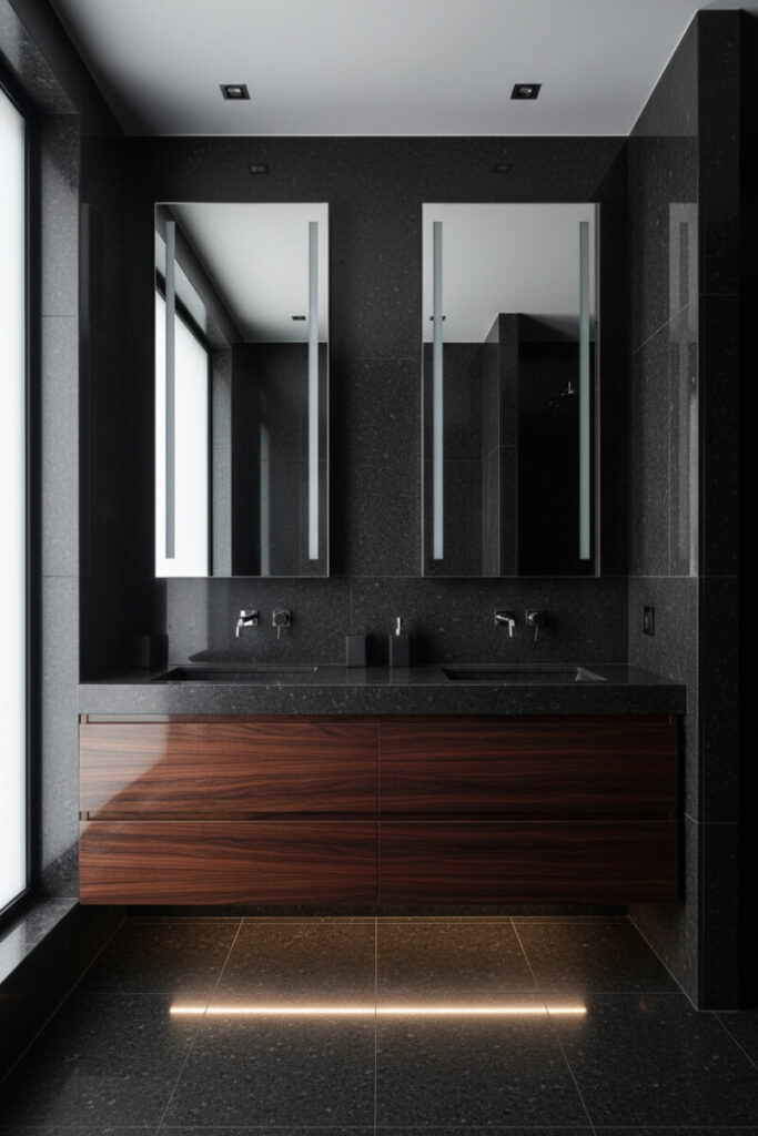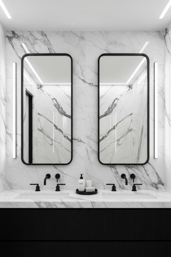 Black frames deliver sharp definition against marble or pale plaster. They’re indispensable when you want graphic clarity without ornate detail. Space your mirrors with vertical light bars between and on the sides to keep illumination even; matte black faucets echo the frames and complete a tight monochrome story. It works across modern, transitional, and even Japandi spaces.
