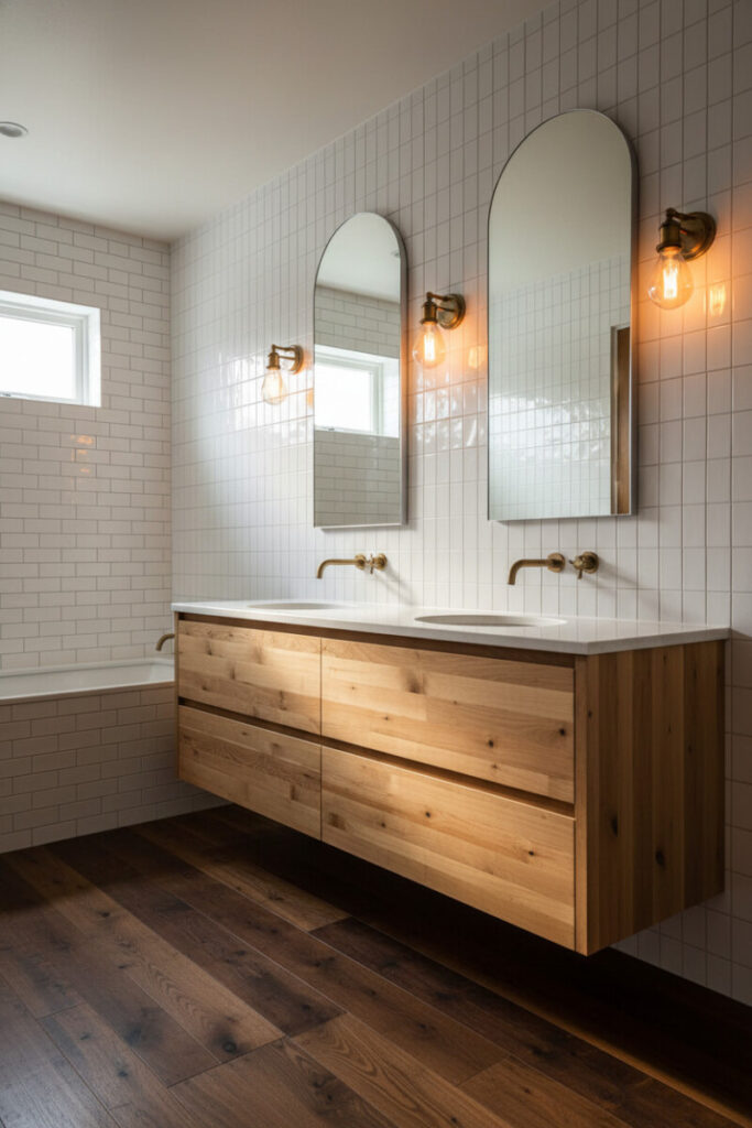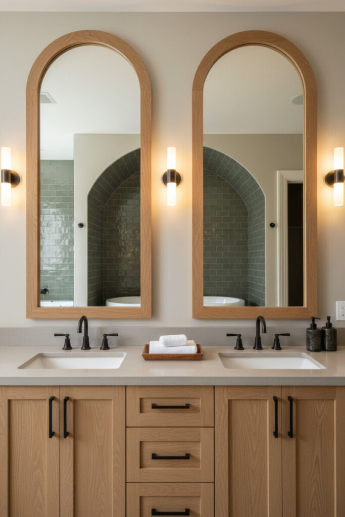 Arches soften straight vanity lines and echo architectural curves from doorways or showers. In spaces with strong vertical tile, arched silhouettes add lift without visual fuss. For Double Bathroom Vanity Mirror Ideas that feel current, choose narrow arches with slim frames in oak, brass, or matte black. Mount them just above the backsplash and add warm sconces between the arches to establish rhythm and eye-level illumination. If your ceiling is low, an arched top tricks the eye and increases perceived height—an elegant solution frequently recommended in bathroom mirror ideas roundups.