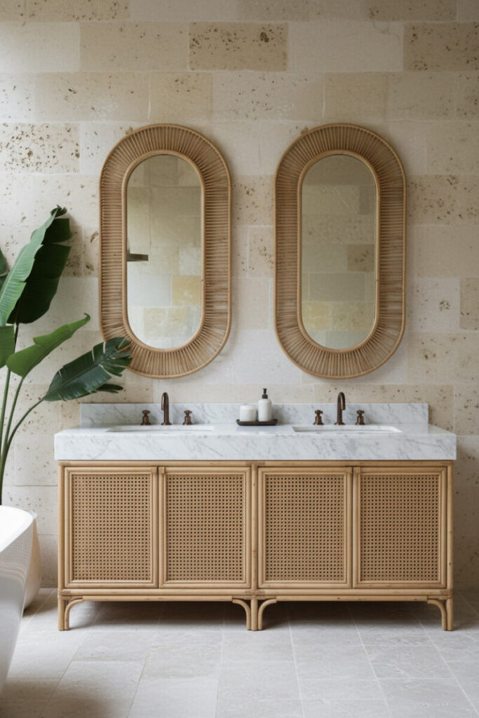 Rattan and cane-wrapped mirrors add tropical ease and tactile warmth, especially when paired with travertine or limestone. To keep it sophisticated (not beachy), choose slim, evenly wrapped reeds and pair with bronze or copper faucets. This is one of the most distinctive ideas for organic modernists. Add a single oversized leaf in a vase for sculptural greenery.