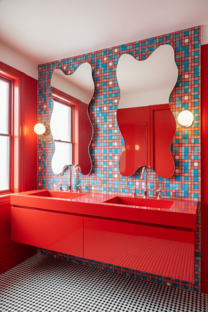 Maximalist, asymmetrical “wavy” mirrors are pure joy—especially when set against bold red lacquer and a vibrant mosaic backsplash. Keep sconces spherical and minimal to echo the curves without competing. For Double Bathroom Vanity Mirror Ideas that make a statement, wavy silhouettes are the art piece and the grooming tool. Ground the look with black-and-white flooring so the color story stays intentional, not chaotic.