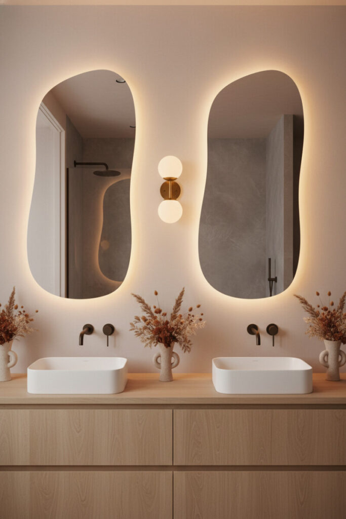 Organic, free-form mirrors are art and function in one gesture. Backlit versions create a halo that replaces the need for bulky fixtures. If you love sculptural décor, this is one of the most modern designs to try—especially in plaster or tadelakt bathrooms. Keep faucets streamlined and let ceramics or dried botanicals echo the mirrors’ curves. Dim-to-warm LEDs enhance evening rituals and keep skin tones natural—one reason this category ranks among the best mirrors for double vanity setups in contemporary homes.