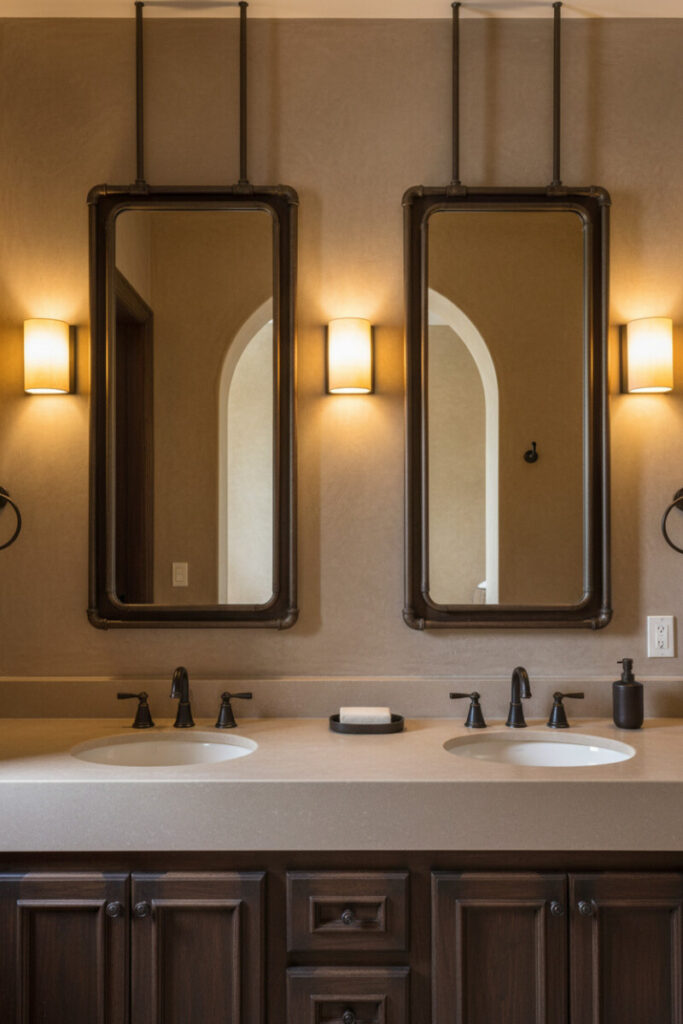 Bronze offers earthy depth that complements stone, plaster, and stucco textures. Piping-style frames nod to industrial heritage while staying upscale in resort-like, Mediterranean palettes. If your vanity uses dark wood or stone, bronze prevents the composition from feeling flat. This is one of those Double Bathroom Vanity Mirror Ideas that’s all about mood: low, amber lighting and tactile walls create a calm, spa-forward experience. Pair with oval undermount sinks and oil-rubbed hardware for cohesion.