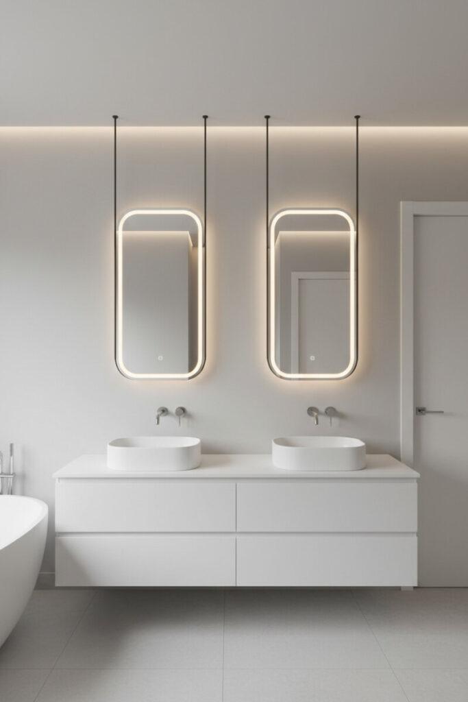 Integrated LEDs wrap each mirror in a uniform halo, eliminating shadows at the cheekbones—excellent for makeup and shaving. This is among the most practical Double Bathroom Vanity Mirror Ideas for busy households because the light is both task-ready and energy efficient. Look for CRI 90+ and dimmable drivers. Ceiling cove lighting adds a soft wash and reduces contrast so the whole wall feels seamless, modern, and serene—an ideal complement to floating vanities.