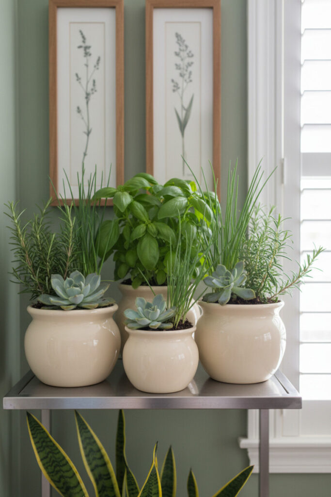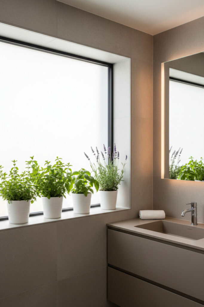 Place a line of peppermint, basil, and flowering lavender in matte white pots on a bathroom ledge just beneath a frosted window. The diffused light and higher humidity make bathrooms surprisingly herb-friendly. Combine with a floating taupe vanity and subtle LED accents for spa calm.