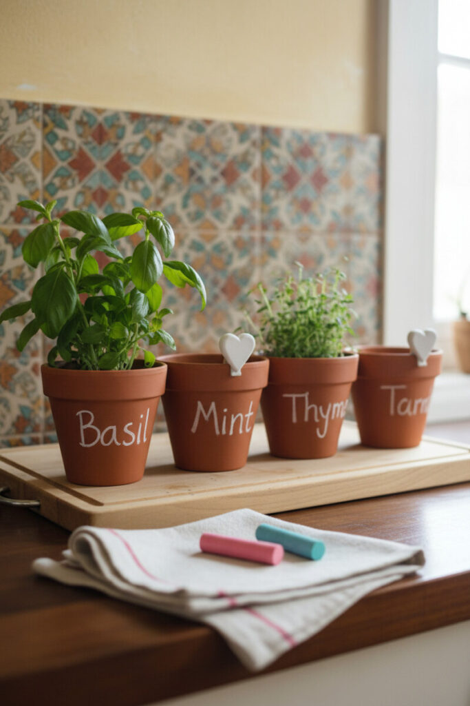 Nothing beats terracotta pots labeled with chalk—Basil, Mint, Thyme—on a pale wooden cutting board. It’s charming and functional: housemates know what’s what, and you’ll remember which potting mix each plant liked best. Keep chalk markers handy so you can update names as plants rotate in and out.