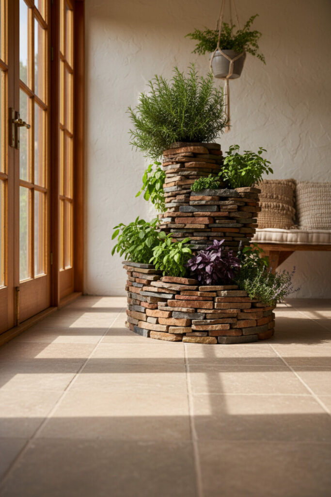 Bring the permaculture classic indoors: a stacked flagstone spiral that offers micro-zones for herbs with different preferences. The top stays drier and sunnier (great for rosemary), mid-levels suit basil and parsley, and the lower, shaded tiers accommodate mint and lavender. Place the spiral near warm wood doors where afternoon light rakes across the stones, emphasizing texture.