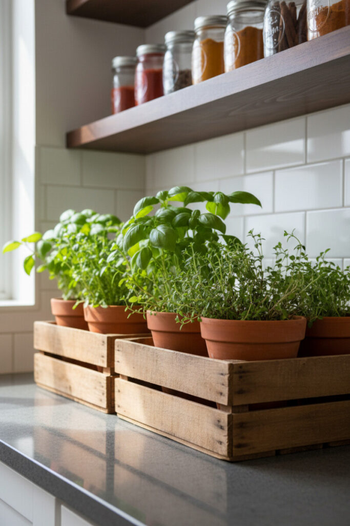 Nest terracotta pots inside weathered wooden crates on a dark countertop. The rough wood, glossy white subway tile, and thick shelf above evoke an artisan pantry. Crates corral multiple pots and let you rotate the whole collection to chase the sun. This is one of the most adaptable herb planter ideas for renters who can’t mount heavy fixtures.