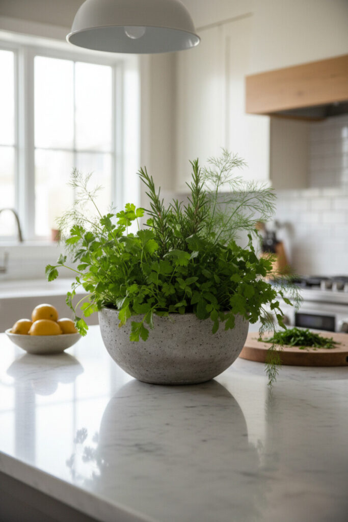 Grow an exuberant bouquet of cilantro, rosemary, and dill in a wide, low ceramic bowl and set it center stage on your island. In high-key light, the polished marble countertop mirrors the greenery, turning everyday cooking into a showpiece. Keep a small bowl of lemons and a cutting board nearby to signal “clip and cook.”