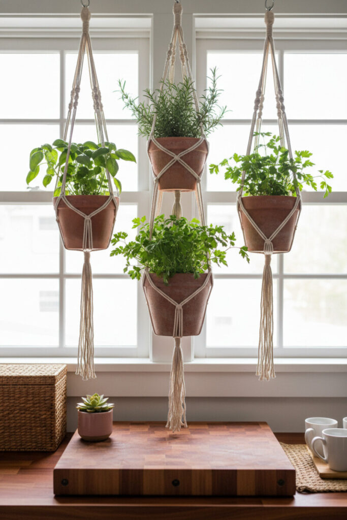 Creamy macramé hangers with tassels bring soft texture to a sun-washed window. Their airy spacing creates even light and airflow for basil, parsley, and rosemary. Pair with a mahogany butcher-block counter and a woven basket for a boho-modern blend.