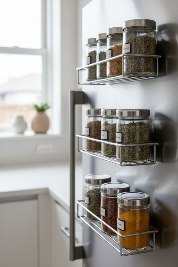 - Blend fresh and dried. Magnetic jars (Idea 16) keep a dependable flavor baseline, while living pots deliver brightness.