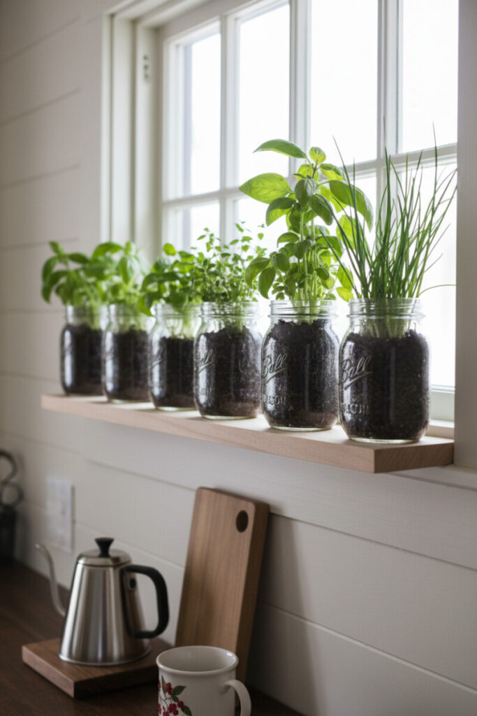 Line up clear glass mason jars on a narrow floating shelf right in front of a bright window. You’ll see the roots and soil layers—a built-in biology lesson. To avoid waterlogging, add 1–2 inches of pebbles or expanded clay at the bottom and water lightly. A gooseneck kettle and a berry-patterned mug on the counter below complete the cozy vignette.