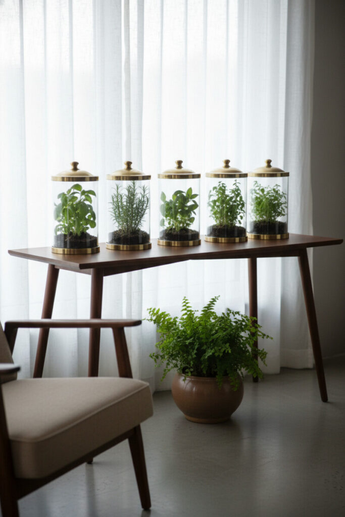 Line five cylindrical glass terrariums on a mid-century walnut console. Each holds a different herb—tiny basil, baby rosemary, compact thyme—capped with polished brass lids. Set the row near sheer-curtained windows for soft backlight. Terrariums elevate humidity while keeping soil isolated from your furniture. They’re particularly helpful for small apartments or rooms without sinks.