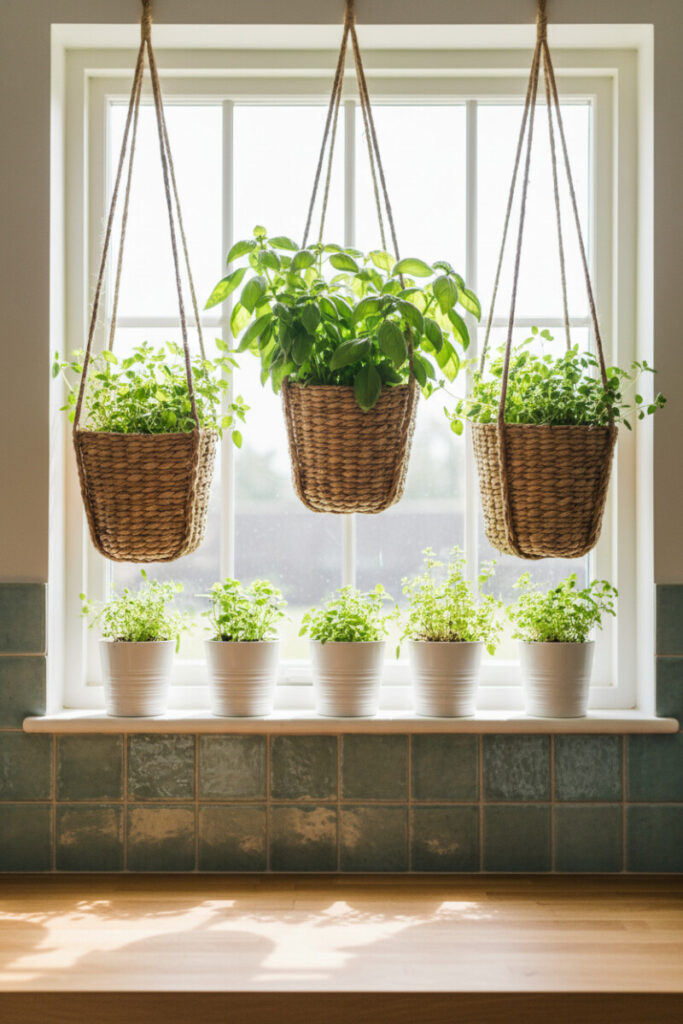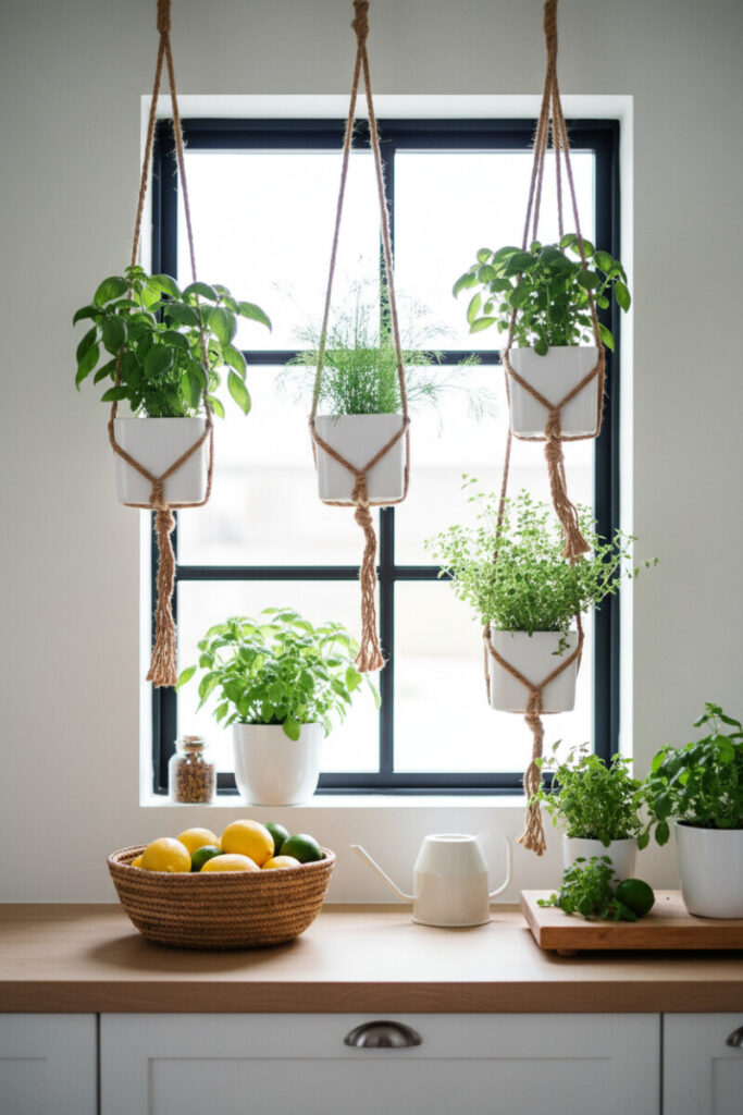 Suspend square white planters from the ceiling with sturdy jute ropes in front of a large window. Hanging planters free counter space and bathe herbs in light without clutter. Use lightweight, soil-moisture-retaining mixes and install discreet saucers or self-watering inserts to prevent drips. Tuck a basket of lemons and a slim watering can below on the counter for a fresh, Scandinavian vibe.