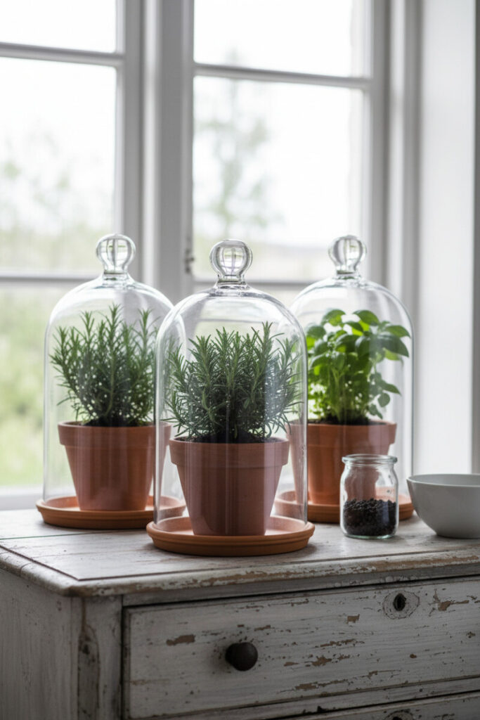 Slip terracotta pots beneath glass cloches to create tiny, steamy micro-greenhouses for rosemary and basil. The domes trap humidity and shield against cold window drafts. On bright mornings, the glass glows; on cloudy afternoons, remove the cloches briefly to allow fresh air.