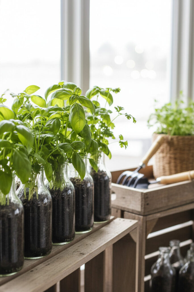 Upcycle clear glass bottles into planters and arrange them on light, unfinished wood shelves. The see-through sides showcase rich, dark soil and the threadlike roots—great for kids who are curious about plant anatomy. Bright backlighting outlines each leaf, and a nearby basket of tools keeps the scene both pretty and practical.