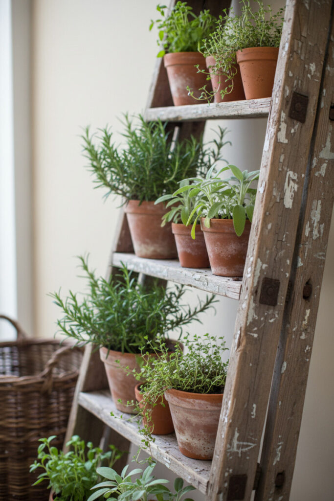 Lean a weathered A-frame ladder against a pale wall and stack tiers of terra cotta pots. The faded gray-brown wood and slightly damp pot surfaces give the whole setup a serene, organic mood. Because the ladder is airy, even the lower tiers get decent light—especially in a room with big windows.