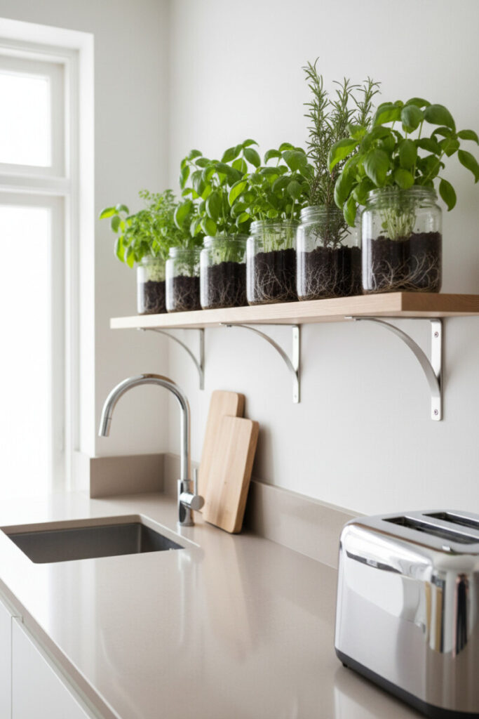 Set seven glass jars packed with herbs on a floating shelf above a pale taupe quartz counter. Visible white root fibers look dramatic against dark soil, and intense side light creates crisp highlights on the glossy leaves. A chrome faucet and a couple of maple cutting boards keep the palette warm and clean.