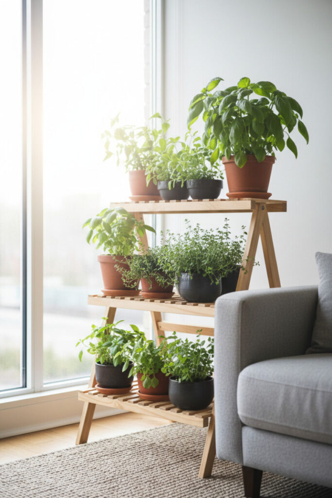 A four-tier natural wood A-frame stand turns a bright corner into a lush herb tower. Mix terracotta and dark ceramic pots for texture and color depth. Intense backlighting from a floor-to-ceiling window creates a magical halo around the leaves—think greenhouse vibes without leaving the living room.