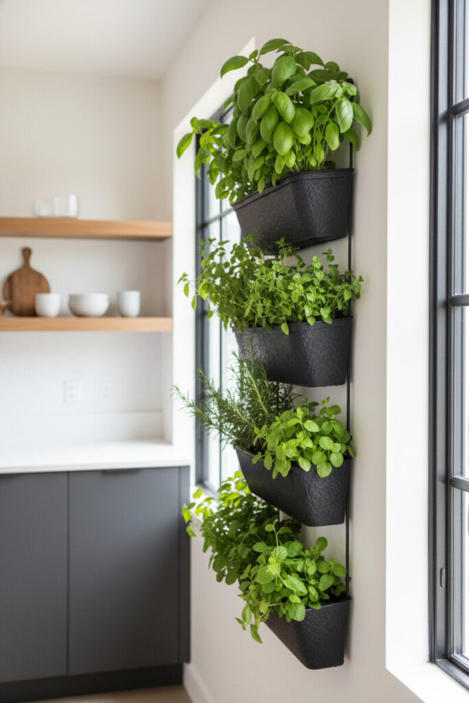 Install a sleek black frame with curved rectangular planters along a bright kitchen wall. This space-saving vertical garden keeps counters clear while delivering arm-length harvests of basil, rosemary, and mint. In modern kitchens with slate-gray cabinets and warm wooden shelves, the deep green foliage becomes the star.
