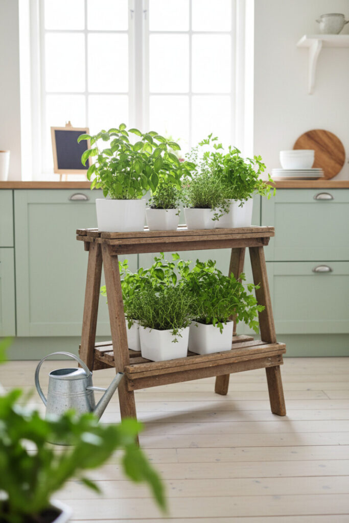 Load a rustic A-frame wooden bench with white square pots of basil, thyme, and parsley. Pale mint or sage-green cabinetry and a light plank floor form a gentle backdrop. A galvanized watering can and a tiny chalkboard sign make the station feel intentional, not temporary.