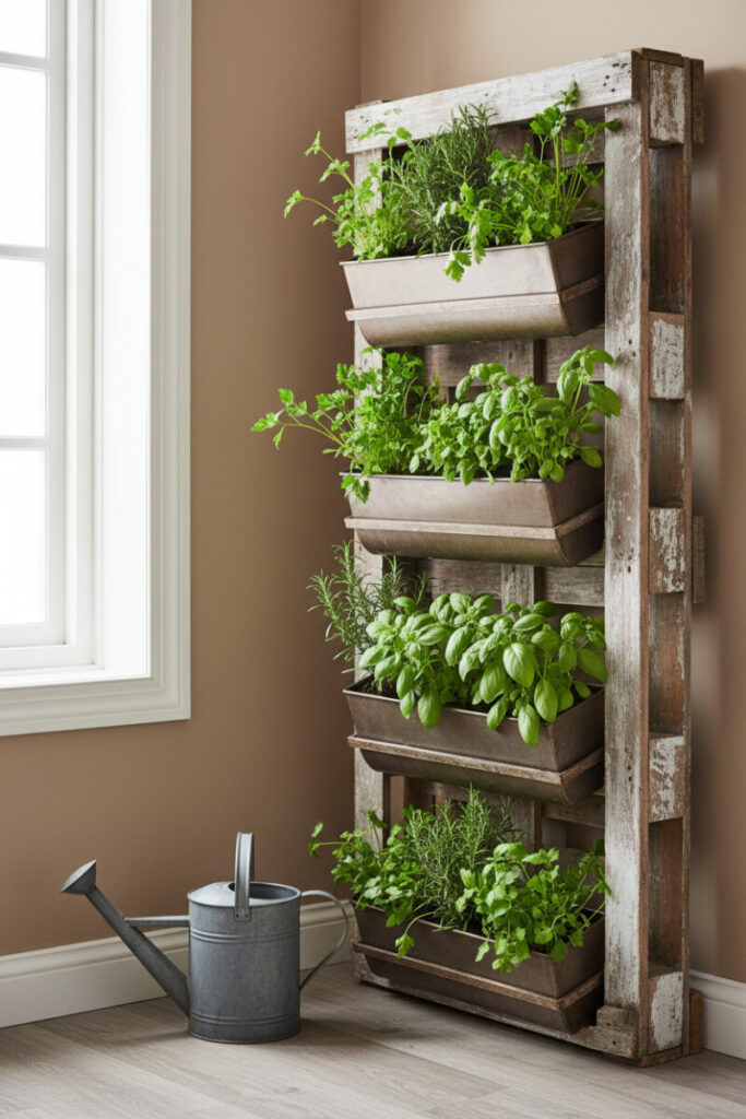 Stand a weathered pallet vertically against a beige wall and slot in bronze-brown metal planters brimming with parsley, basil, and rosemary. A dark slate watering can on the floor finishes the rustic palette. This is an efficient way to turn an otherwise blank wall into a thriving kitchen herb garden without bulky furniture.