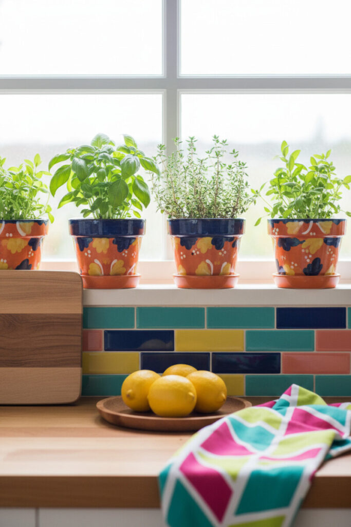 Bold, hand-painted ceramic planters bring cheer to a neutral kitchen. Think tangerine, cobalt, and sunflower yellow with folk-art patterns. Backlighting from a white-paned window accentuates the glaze and leaf textures. Keep the look cohesive by repeating one accent color (such as cobalt) in your tea towel or cutting board stripes.