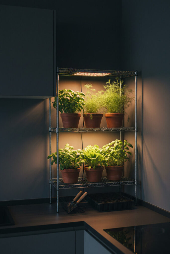 Turn a dark corner into a leafy glow spot with a chrome wire shelf and a warm LED grow panel under the cabinets. Matte terracotta pots anchor the look. This approach gives you precision control over day length (set to 12–14 hours in winter) and spectrum, which is helpful if you’re aiming for the best herbs to grow indoors year round without relying on windows.